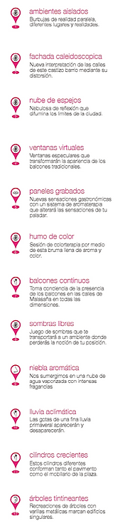 Te verás inmerso en una sesión de colorterapia a tu paso por este lugar. Tu vista se nublará por esta bruma llena de aroma y color. Más o menos densa, esta nube de color te permitirá intuir la ciudad con un filtro visual y aromático que hará que te resulte un lugar nuevo e irreconocible, descúbrelo.